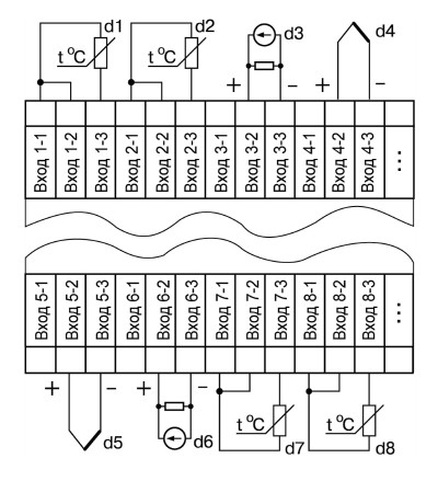 - Вісім універсальних входів * для підключення від 1 до 8 датчиків різного типу в будь-яких комбінаціях, що дозволяє одночасно вимірювати і контролювати кілька різних фізичних величин (температуру, вологість, тиск і ін.)