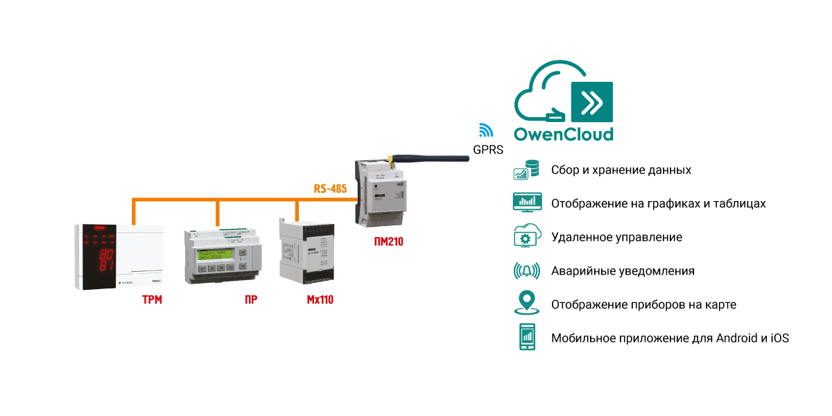 Виступаючи в ролі майстра мережі ОВЕН ПМ210 опитує прилади, підключені по RS-485, і передає дані в хмарний сервіс.