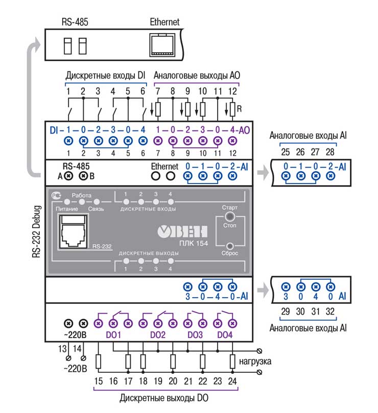 Схема підключення харчування, дискретних входів і виходів ПЛК154