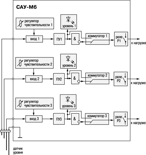 - три незалежні канали контролю рівня рідини в резервуарі